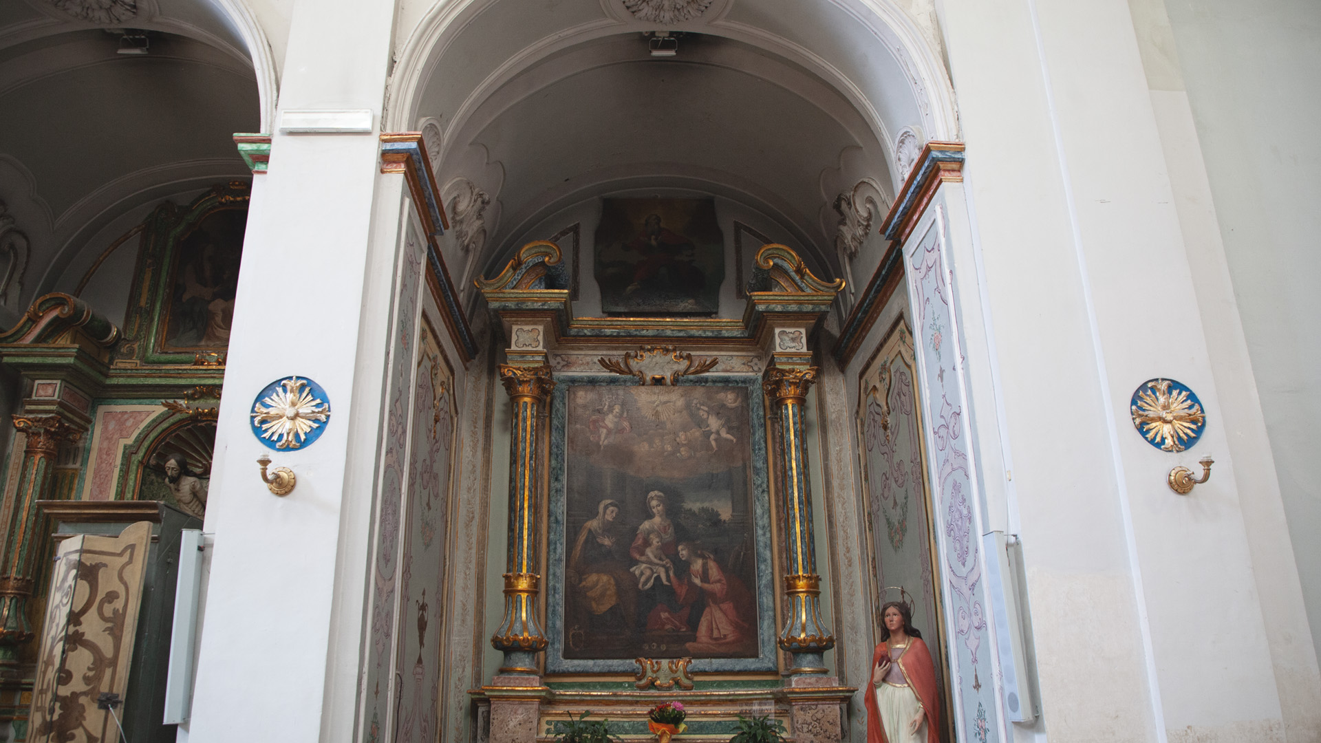 La chiesa conserva otto altari, ciascuno con la propria cappella. Il primo ospita oggi una statua dell’Addolorata, con sopra una piccola tela raffigurante la Flagellazione. Il secondo è dedicato a Sant’Irene, patrona minore di Bitonto dal 1747, proprietà della famiglia De Facendis. Tra le cappelle più significative si trova quella di San Francesco da Paola, appartenuta alla famiglia De Ilderis.