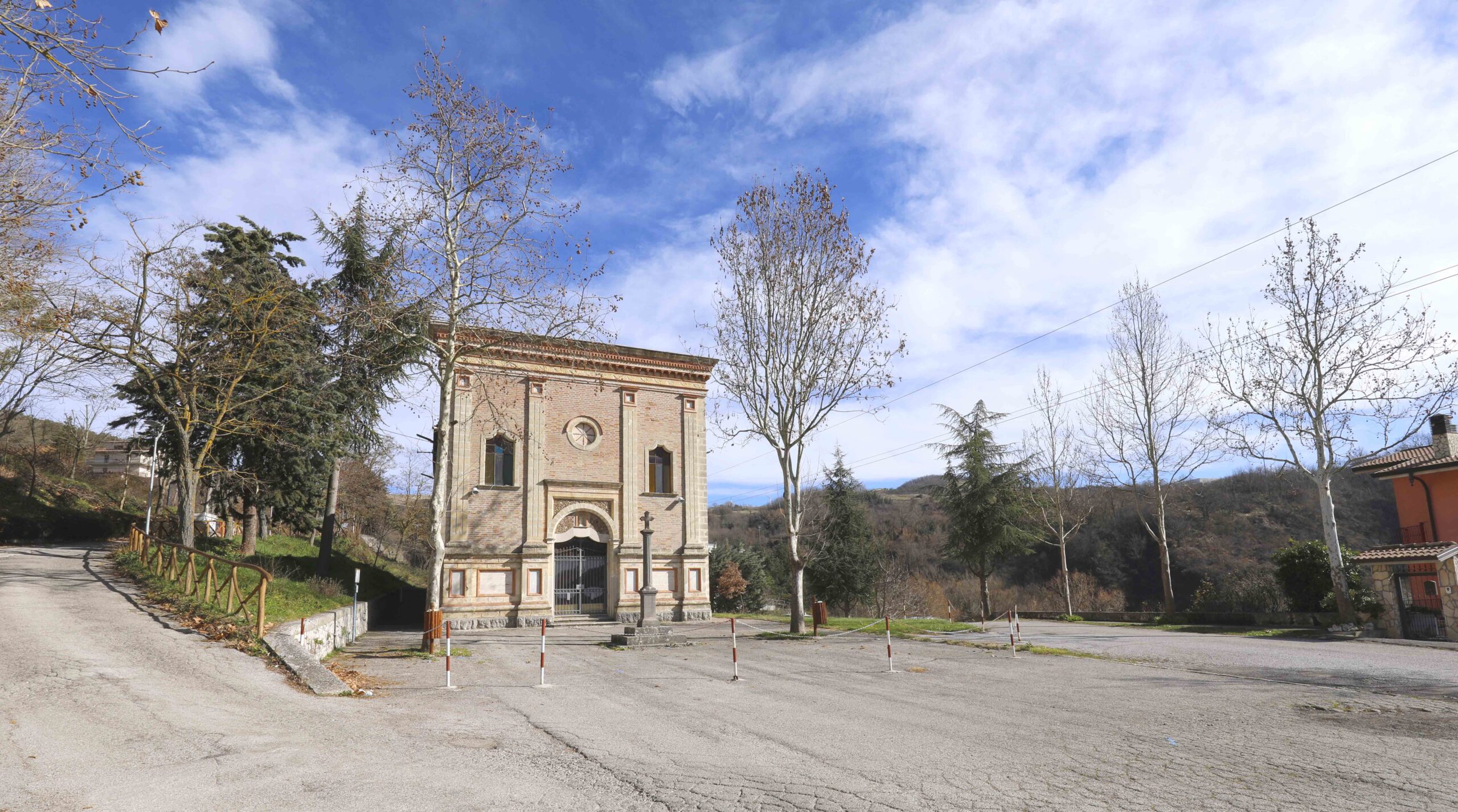 L’edificio, a navata unica, presenta una facciata rettangolare, addossata nel 1965 a quella originaria caratterizzata da un timpano triangolare seguente l’andamento delle due falde di copertura.