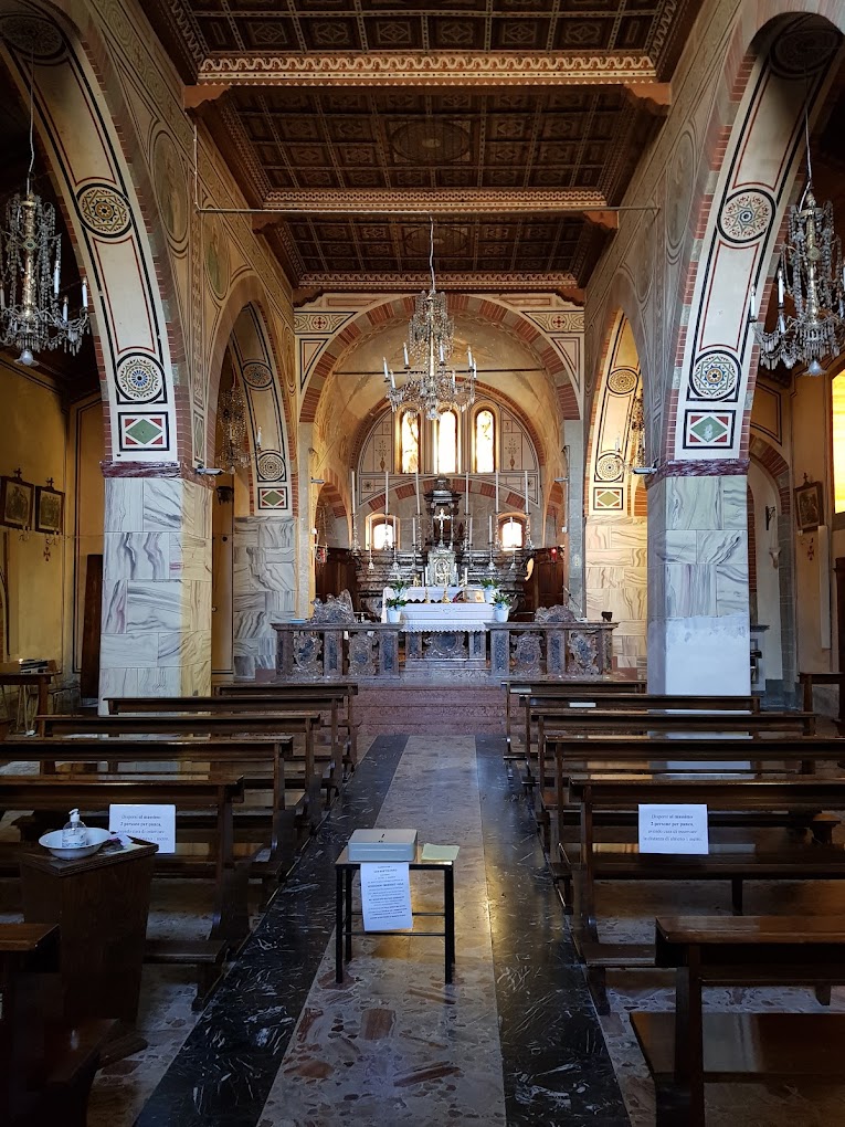 L’interno è composto da tre navate, ciascuna suddivisa in tre campate e sostenuta da pilastri che reggono archi a tutto sesto. In fondo alla navata centrale si apre il presbiterio, coperto da una volta a botte e concluso da un’abside di forma quadrata.