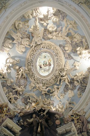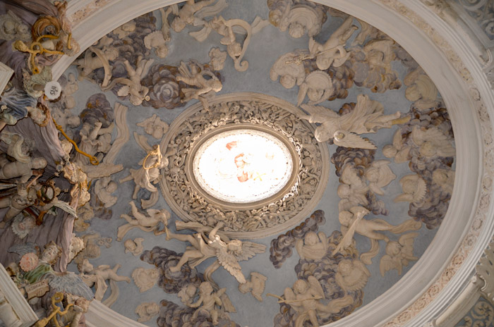 L’altare barocco, con la sua imponente decorazione, rievoca la celebre apparizione, creando una traduzione materica del miracolo. La cupola, affrescata con scene celesti, ospita al centro la figura del Padre Eterno, che benedice con una mano mentre con l’altra regge il globo terrestre. Intorno, angeli e puttini festanti animano la scena con canti e danze. Questo tripudio celeste si proietta sulla dimensione terrestre attraverso una scenografica cortina che avvolge l’altare sottostante. Angeli e cherubini sorreggono un baldacchino rosa antico che si apre teatralmente, rivelando l’immagine della Vergine – in abito rosa e manto azzurro -, mentre porge a San Domenico un dipinto che lo raffigura.