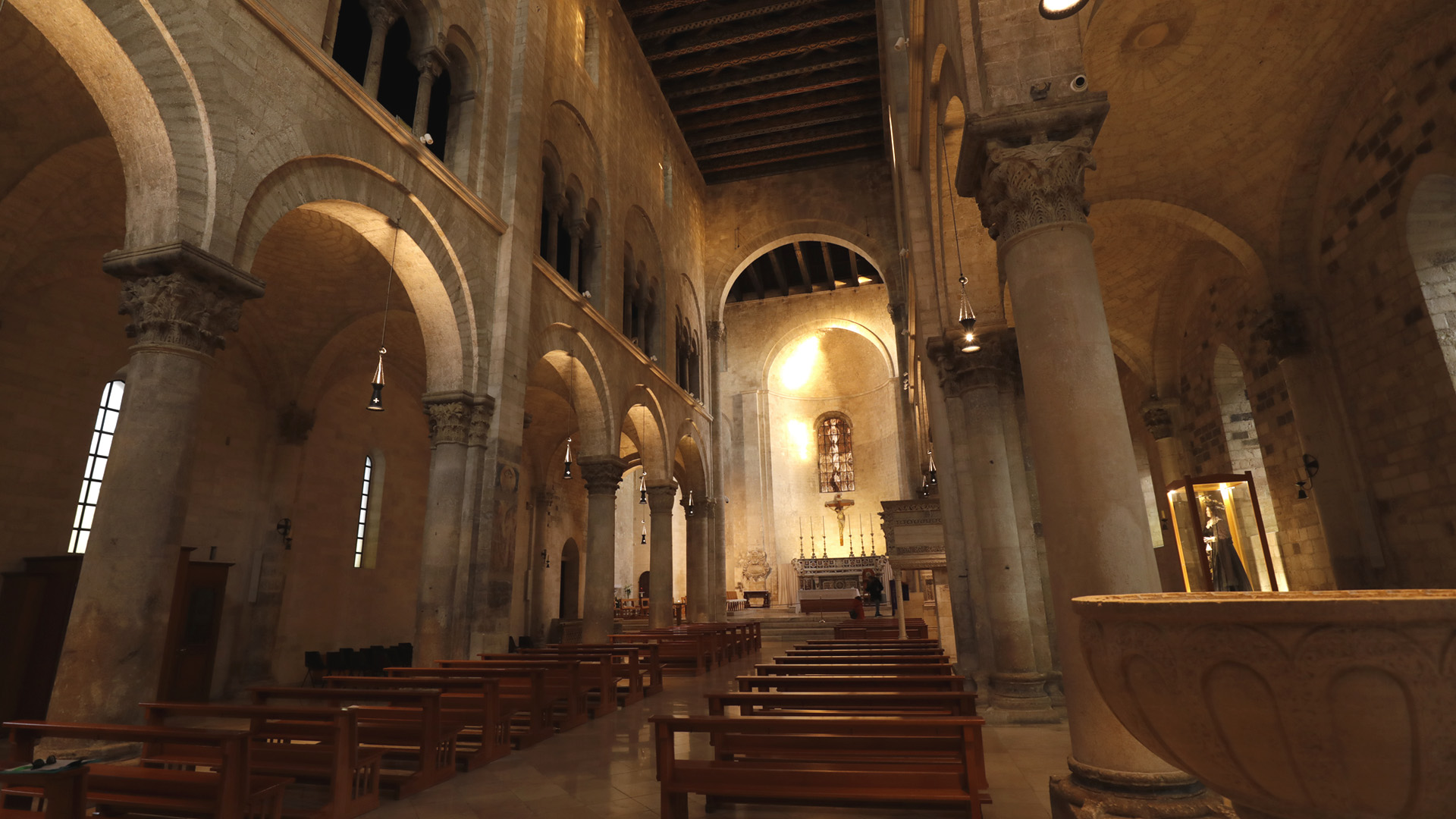 Il fonte battesimale, una vasca monolitica della bottega di Nicolaus, è un’opera straordinaria, priva di giunzioni e capace di vibrare come una campana quando percossa.