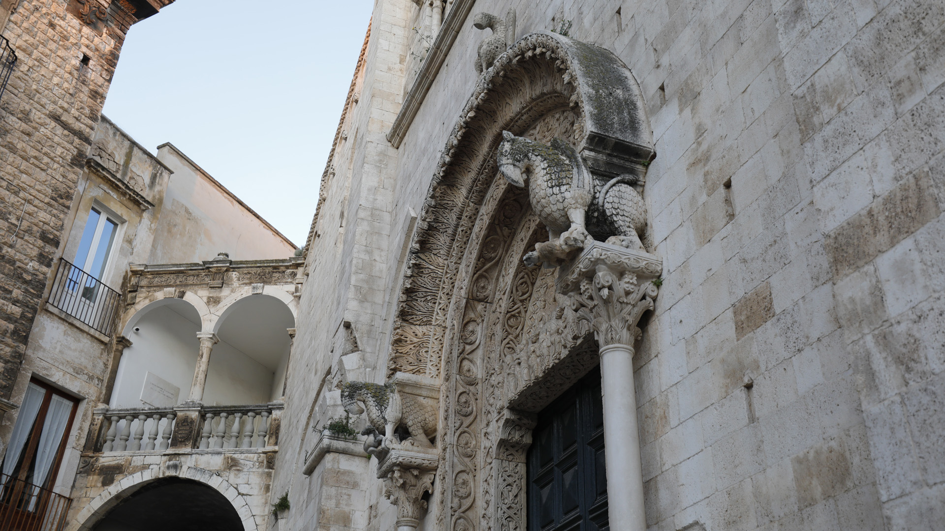 L’archivolto è sorretto da due grifoni, simboli della doppia natura di Cristo, che agguantano un caprone e una lepre, raffigurazioni del male. I grifoni poggiano su colonnine e su due leoni scolpiti, oggi logorati dal tempo, che anticamente presidiavano l’ingresso. Al vertice dell’archivolto si trova una scultura che per lungo tempo si è creduto fosse un’aquila, simbolo degli Svevi. In realtà, le caratteristiche del becco e degli artigli suggeriscono si tratti di un pellicano, animale simbolo della Redenzione: secondo la tradizione, il pellicano si squarcia il petto per nutrire i propri piccoli: immagine del sacrificio di Cristo.