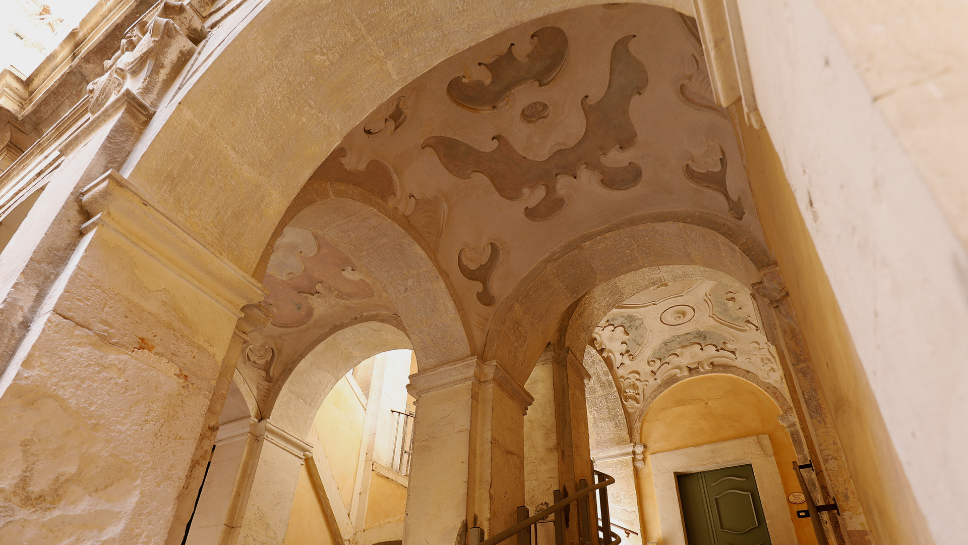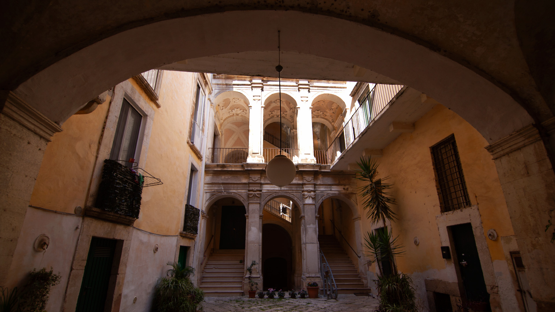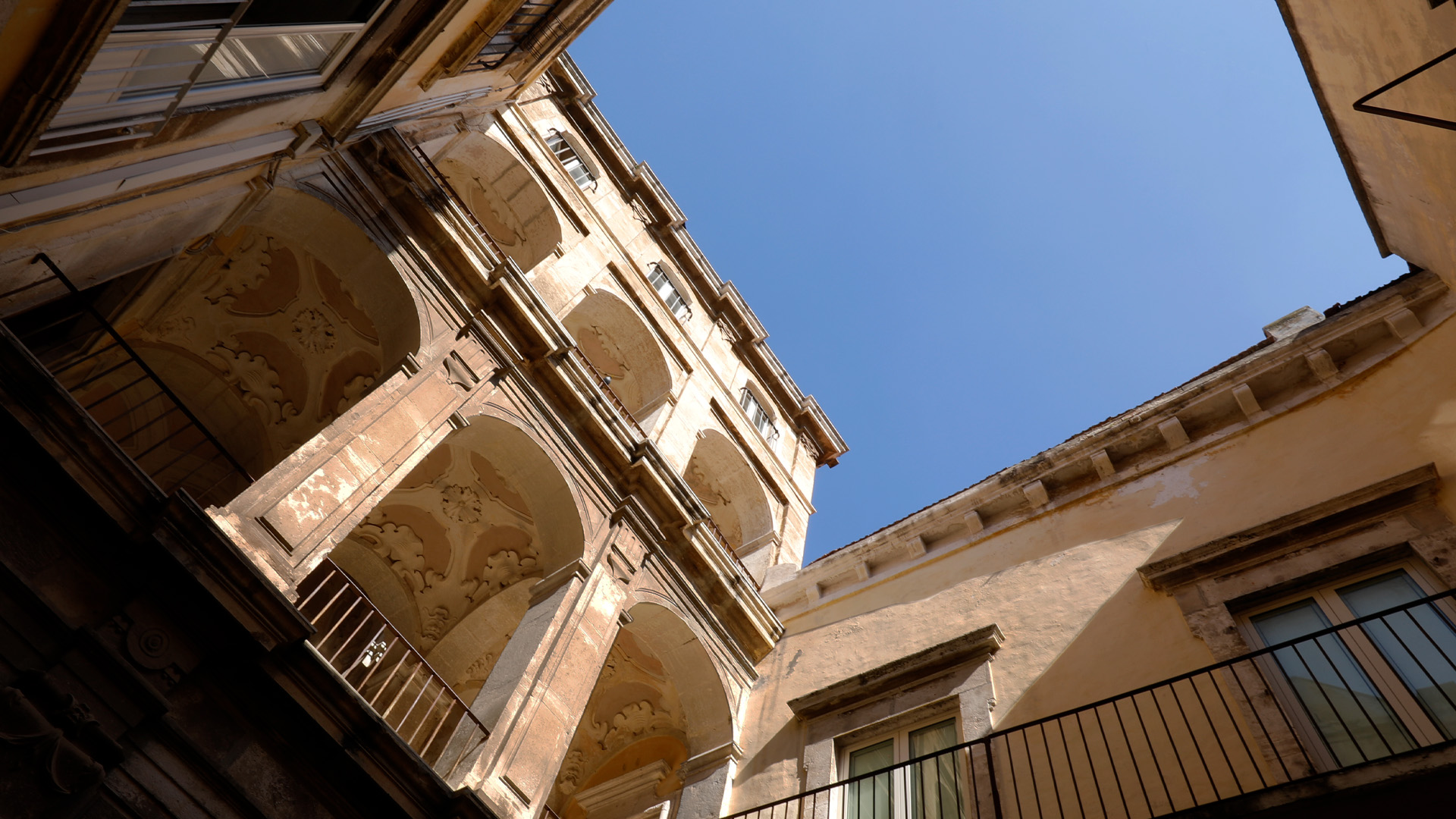 Superata la severa facciata, si accede all’androne coperto da una volta ribassata che conduce in un ampio cortile interno. Qui lo sguardo è catturato dal magnifico loggiato a tre ordini, ispirato ai palazzi napoletani progettati da Ferdinando Sanfelice nel Settecento. Le arcate del loggiato incorniciano la scenografica scala a tre rampe in pietra lavica, che si eleva con eleganza fino ai piani superiori. Gli stucchi bianchi, ricchi di dettagli fantasiosi, conferiscono alla scala un gusto spiccatamente rococò. Al centro del cortile si trova una vera da pozzo, chiara testimonianza della presenza di una cisterna, elemento indispensabile per la raccolta dell’acqua.