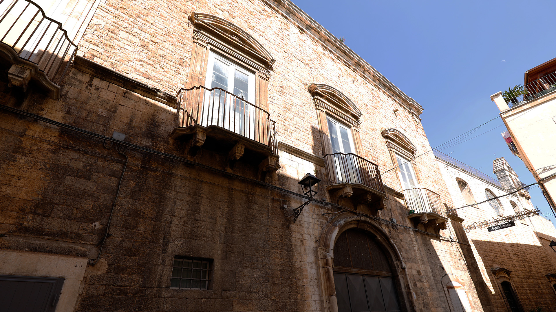 Il grandioso edificio quadrangolare occupa un intero isolato, dominando con la sua imponenza il cuore storico di Bitonto. Sorge in una zona privilegiata, affacciata sul tracciato dell’antica Via Appia-Traiana. La lunga facciata che segue il percorso di via Porta Robustina conserva l’assetto seicentesco e settecentesco della fabbrica architettonica, testimoniando il prestigio delle famiglie che vi hanno abitato.