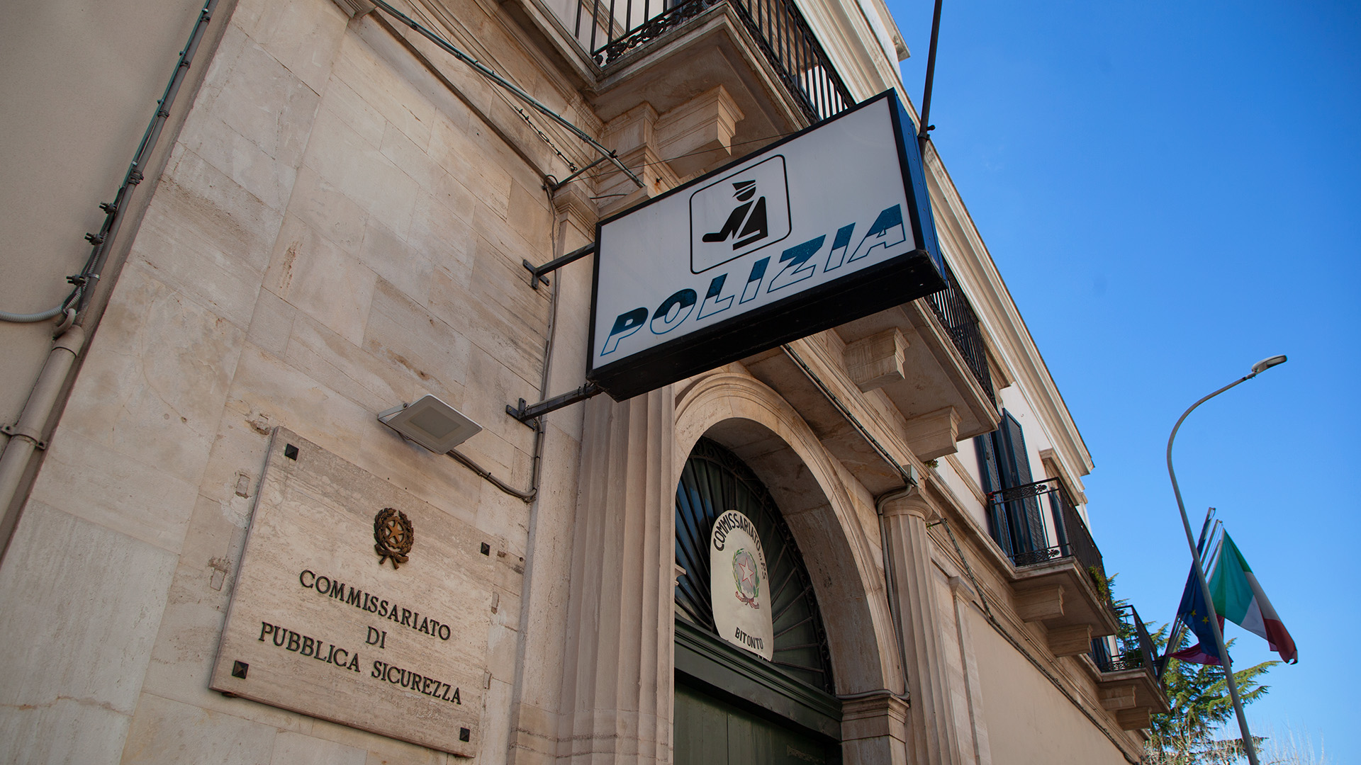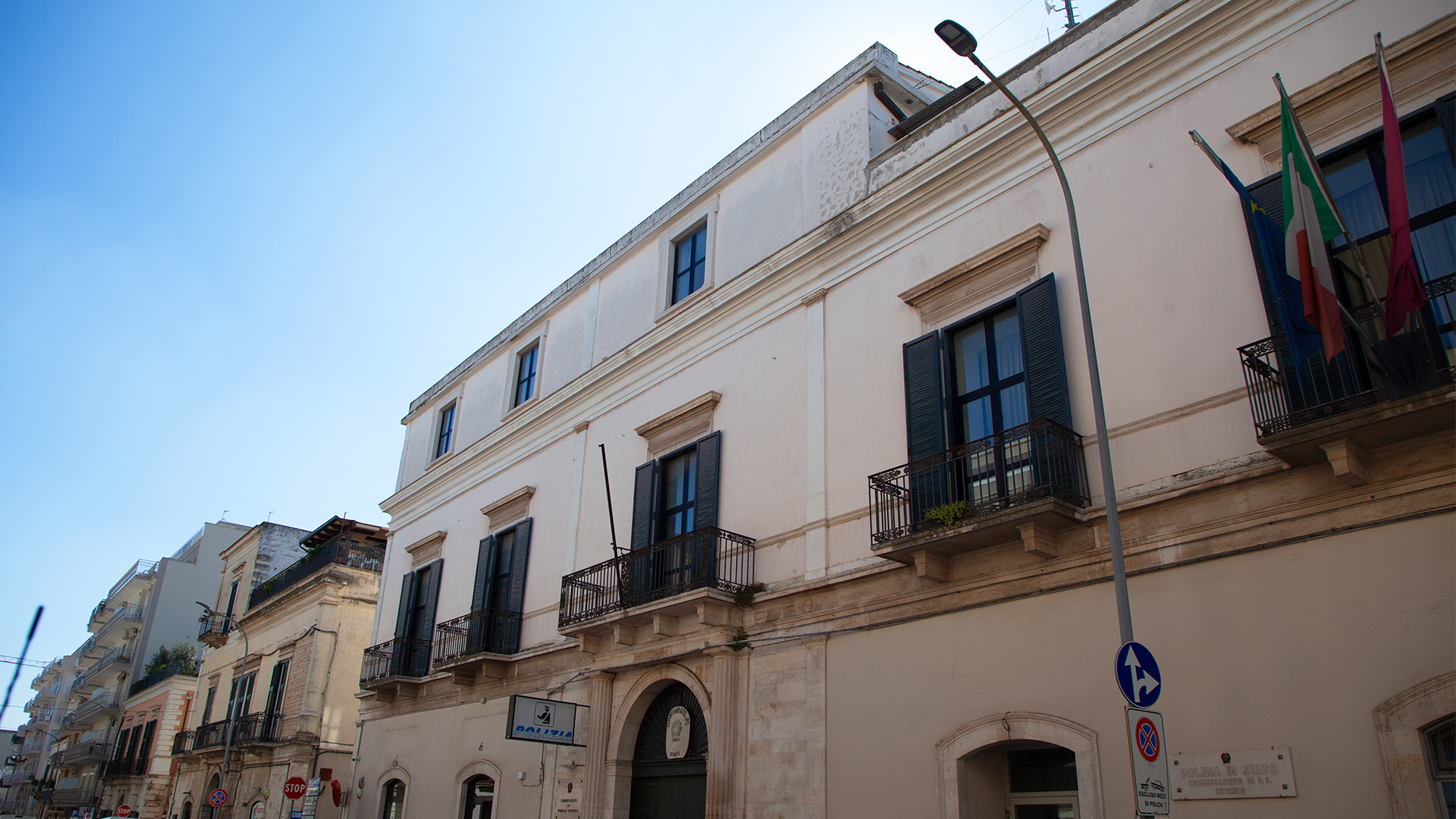 La pavimentazione alterna pietra sbozzata a lastroni di lava, creando un raffinato contrasto materico. L’unico elemento decorativo di rilievo si trova nella volta dell’androne, dove il bianco degli stucchi e delle cornici si contrappone al rosso pompeiano dei campi affrescati. Nei quattro riquadri angolari, Ventafridda scelse di rappresentare simbolicamente le arti maggiori – pittura, scultura, architettura e musica – avvolte da rami di alloro. Un dettaglio che riflette il gusto eclettico e la sensibilità artistica di uno dei personaggi più illustri della cultura bitontina.