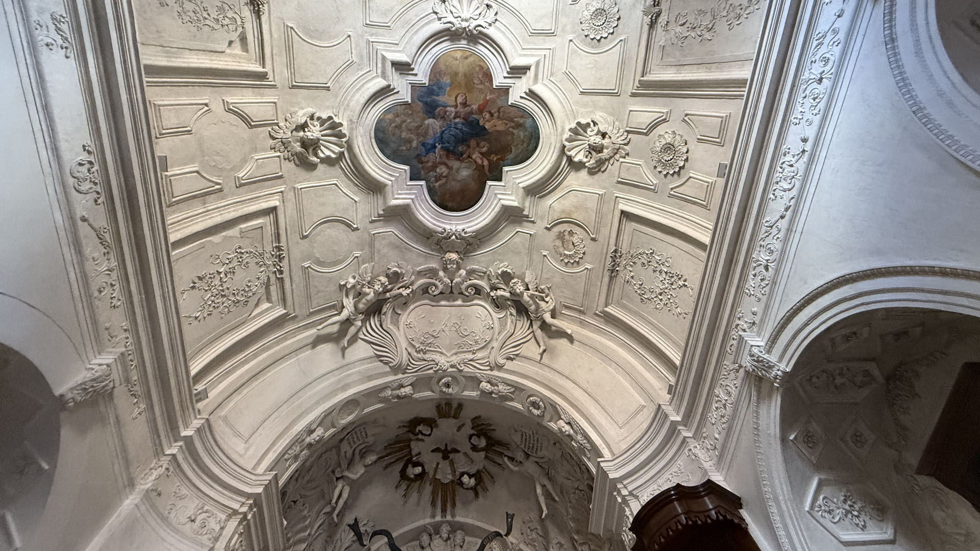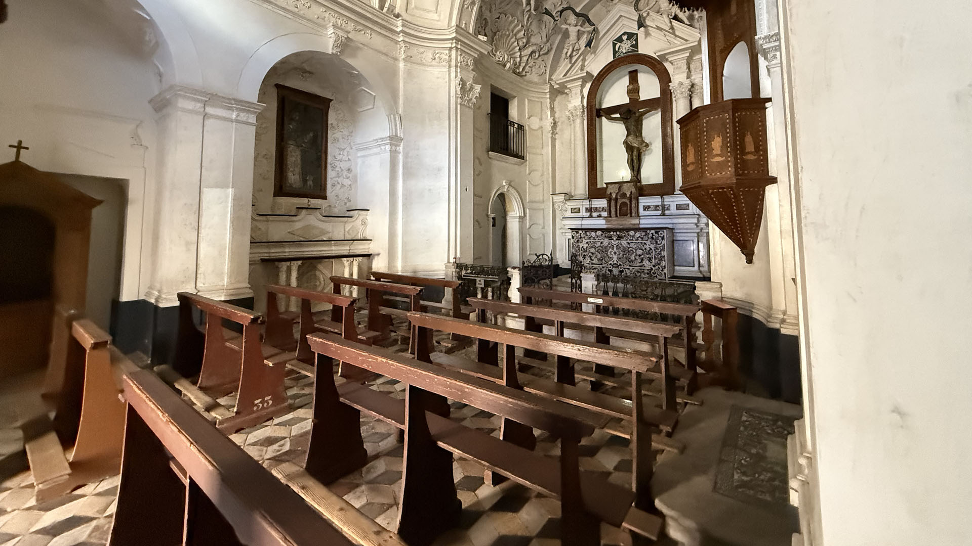 Lo stile barocco spagnolo è dominante: lo si legge nel maestoso Crocifisso del Settecento, nella struggente statua dell’Addolorata, e nello splendido pulpito in legno.